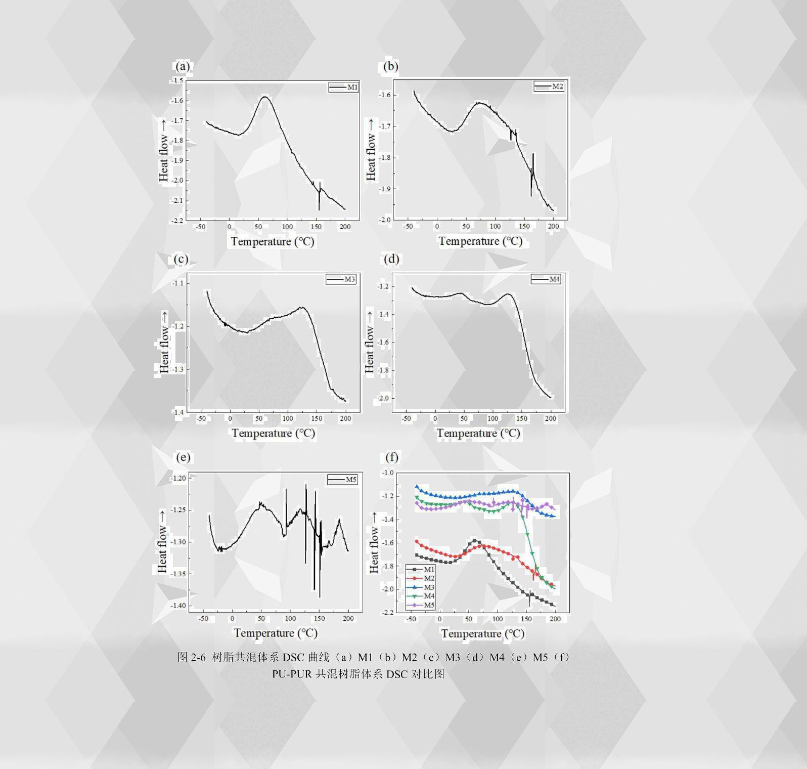 從PU-PUR共混樹(shù)脂的DSC曲線對(duì)其固化行為進(jìn)行分析。從M1樹(shù)脂的DSC曲線2-6(a)上看到,曲線在35.41-86.16℃之間出現(xiàn)了一個(gè)明顯的放熱峰,這就是M1樹(shù)脂的固化反應(yīng)峰,其峰值為59 .66℃。從M2樹(shù)脂的DSC曲線2 - 6(b)上看到,曲線在45.16-120.16℃之間出現(xiàn)了一個(gè)明顯的放熱峰,這就是M2樹(shù)脂的固化反應(yīng)峰,其峰值為73.66℃。從M3樹(shù)脂的DSC曲線2-6(c)上看到,曲線在94.58-138.25℃出現(xiàn)了一個(gè)明顯的放熱峰,這就是M3樹(shù)脂的固化放熱峰,其峰值為125.08℃。從M4樹(shù)脂的DSC曲線2-6(d)上看到,曲線在98.58-140.83℃出現(xiàn)了一個(gè)明顯的放熱峰,這就是M4樹(shù)脂的固化放熱峰,其峰值為126.16℃。從M5樹(shù)脂的DSC曲線2-6(e)上看到,曲線出現(xiàn)了兩個(gè)較大的放熱峰,其中第二個(gè)較大的放熱峰位于96.50-138.08℃之間,其峰值為116.75℃。通過(guò)不同共混樹(shù)脂的DSC曲線對(duì)比2-6(f)可以看出,聚脲的加入使得共混樹(shù)脂放熱峰朝著較高溫度移動(dòng),而通過(guò)M3、M4樹(shù)脂的曲線可以看出,當(dāng)聚脲含量占到共混樹(shù)脂的50%以上時(shí),共混樹(shù)脂的固化峰值變化不大。從共混樹(shù)脂的DSC曲線和樹(shù)脂流變測(cè)試結(jié)果分析得出,樹(shù)脂DSC曲線的峰值和樹(shù)脂流變粘度-溫度曲線轉(zhuǎn)變點(diǎn)的結(jié)果大致符合,因此表2-3能夠作為樹(shù)脂共混體系的最佳固化溫度和時(shí)間使用。