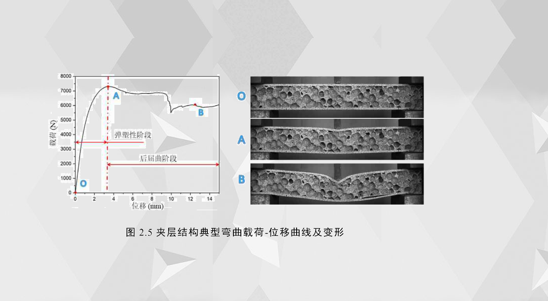 2.3失效模式和結(jié)構(gòu)響應(yīng)圖2.5是泡沫鋁夾層結(jié)構(gòu)彎曲試驗典型的載荷-位移曲線和試件在三個特定位置的變形、破壞圖。根據(jù)載荷-位移曲線的初始拐點和變形、破壞程度,可將載荷-位移曲線分為兩個階段,兩個階段的臨界點位移對應(yīng)的載荷稱為臨界失效模式的臨界載荷。第一階段為彈塑性階段,從O到A,此階段夾層結(jié)構(gòu)主要發(fā)生彈性變形,載荷與位移呈近似線性增長關(guān)系;第二階段為初始拐點至最終破壞,稱為后屈曲階段,此階段夾層結(jié)構(gòu)的局部或者整體發(fā)生明顯變形、破壞。