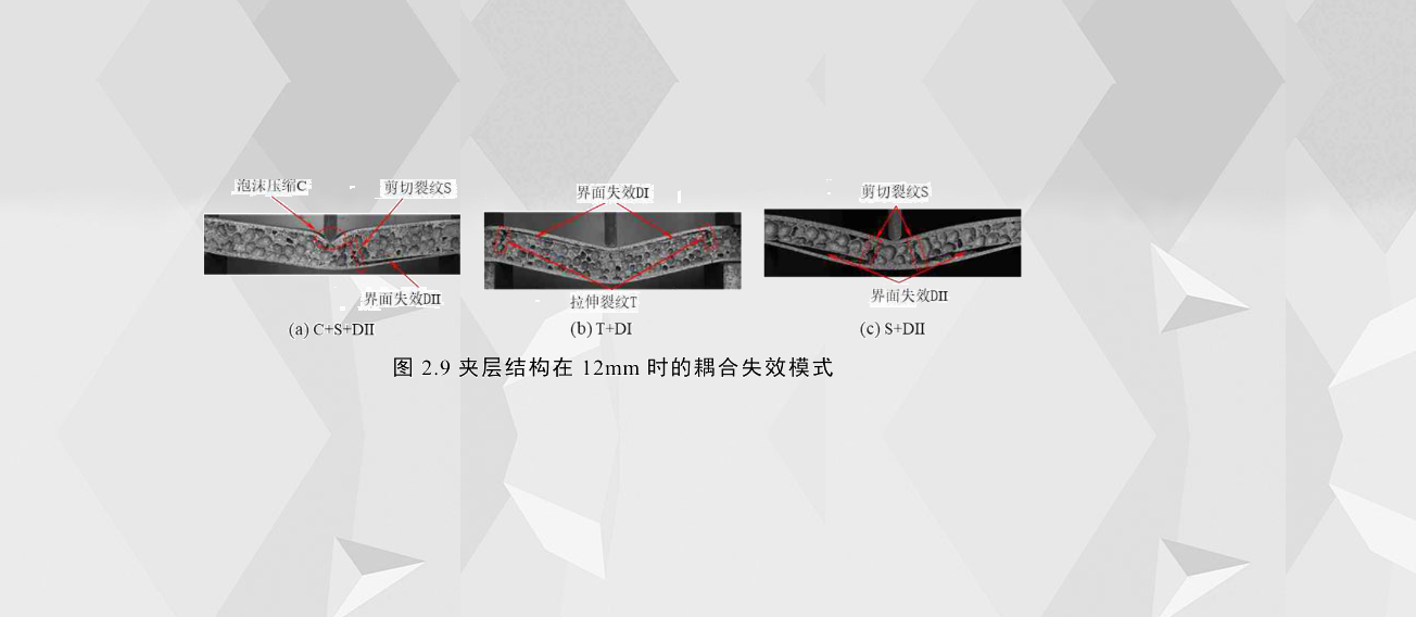 在汽車結(jié)構(gòu)碰撞過程中,對(duì)沖擊動(dòng)能的吸收主要是通過結(jié)構(gòu)的塑性變形以及材料的破壞,因此對(duì)泡沫鋁夾層結(jié)構(gòu)彎曲工況的后屈服變形及失效模式的研究是很有必要的。為了區(qū)分臨界失效模式和后屈服失效模式,定義耦合失效模式用來描述夾層結(jié)構(gòu)在彎曲位移為12mm時(shí)的失效模式。從各夾層結(jié)構(gòu)的耦合失效模式可以看出,其失效模式是十分復(fù)雜的,經(jīng)分析可知,耦合失效模式主要是由前文描述的臨界失效模式演變的失效模式組合。為了清楚地描述各試件的耦合失效模式,用幾個(gè)字符來表示特定的破壞形式:C代表壓頭正下方芯層有明顯壓縮,屬于臨界失效模式IN的演變,S代表壓頭附近芯層有剪切裂紋,T代表支撐端附近芯層有拉伸裂紋,D代表界面失效,屬于臨界失效模式DB的演變,此外,界面失效在上部和下部的破壞位置分別用羅馬數(shù)字I和Ⅱ分別代表上界面和下界面失效,為了直觀地顯示耦合失效模式的特征,圖2.9中顯示了夾層結(jié)構(gòu)在12mm時(shí)幾種典型的耦合失效模式。在鋁合金夾層結(jié)構(gòu)中,只有試件AL-F2和AL-D25的耦合失效模式僅為其本身的臨界失效模式演變,并未夾雜其他失效模式。所有纖維增強(qiáng)夾層結(jié)構(gòu)的耦合失效模式都存在壓頭下方芯層壓縮,并且在壓頭附近均具有剪切裂紋以及沒有界面失效(GF-F1的耦合失效模式中僅出現(xiàn)一種失效模式)。